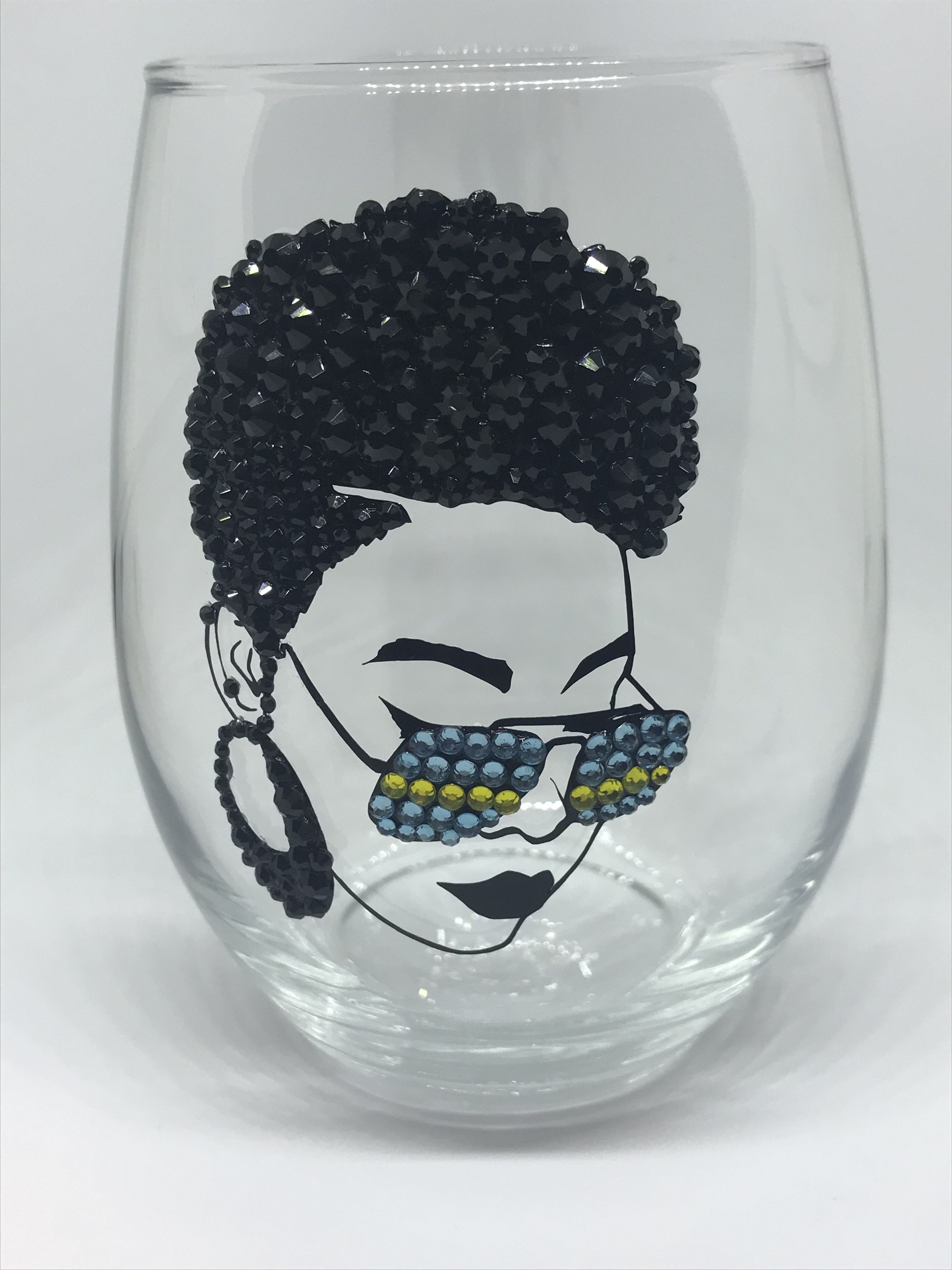 Hand designed wine glass 21oz, adorned with crystal rhinestones. Also available on ceramic mug. Name customization is optional, (not automatically included). Allow 7 to 10 business days for your order to ship. *additional time for large orders of 5 or more* Care instructions: Gentle hand wash. Do not place in dishwasher.