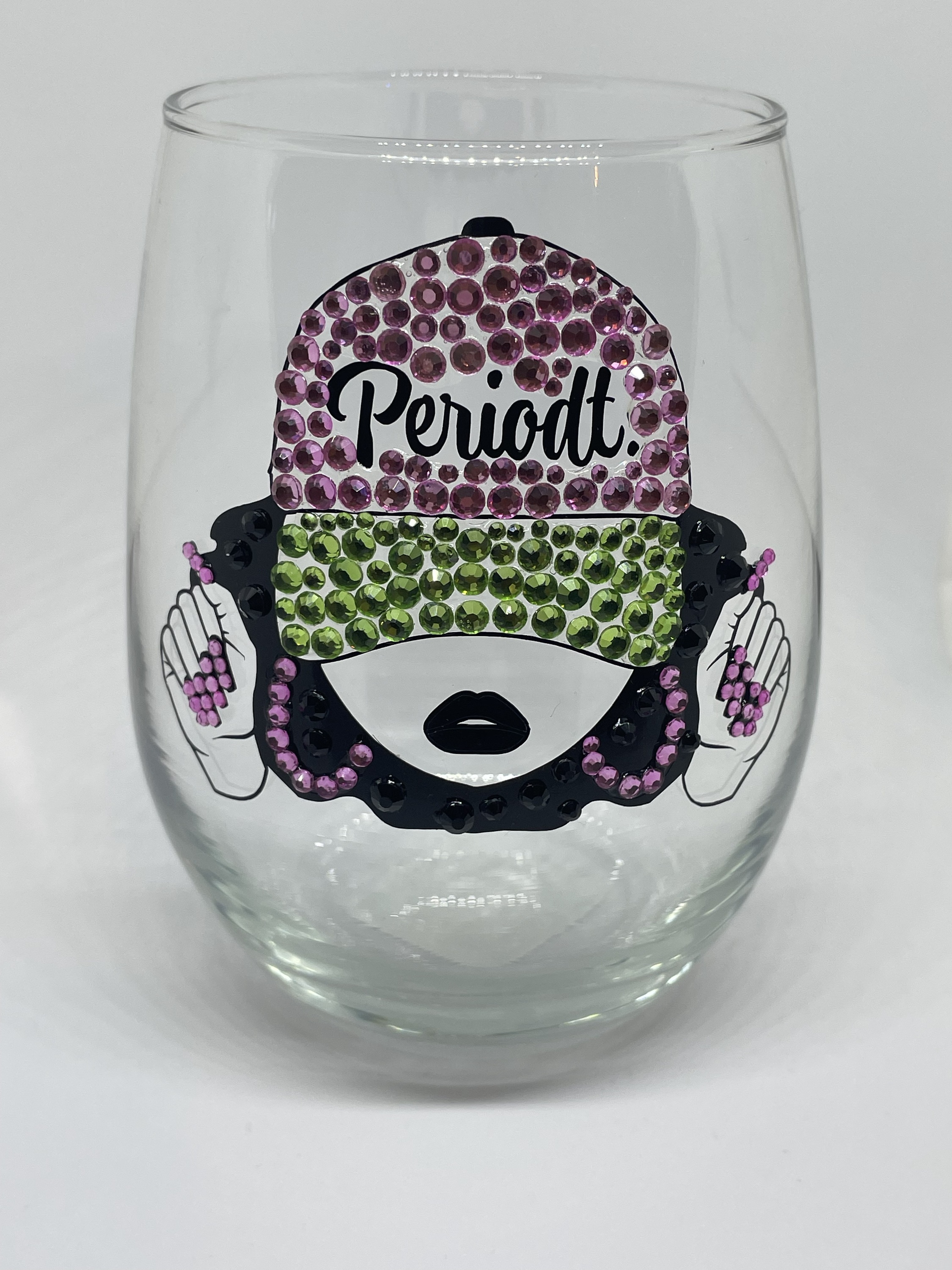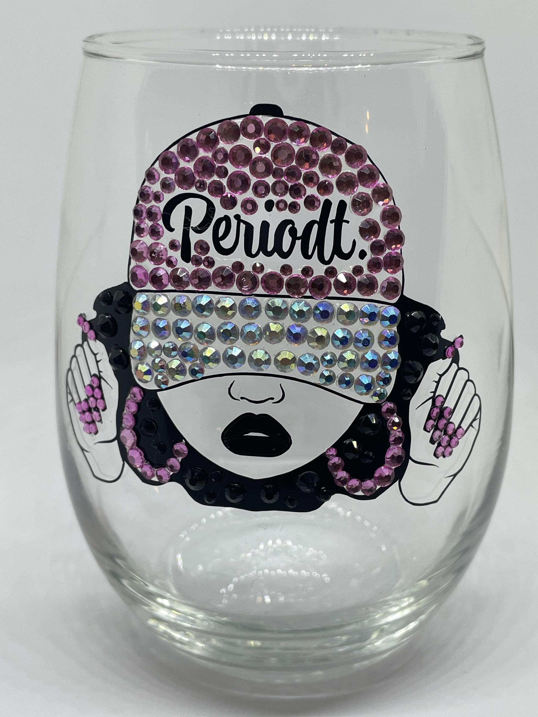 Hand designed wine glass 21oz, adorned with crystal rhinestones. Also available on ceramic mug. Name customization is optional, (not automatically included). Allow 7 to 10 business days for your order to ship. *additional time for large orders of 5 or more* Care instructions: Gentle hand wash. Do not place in dishwasher.